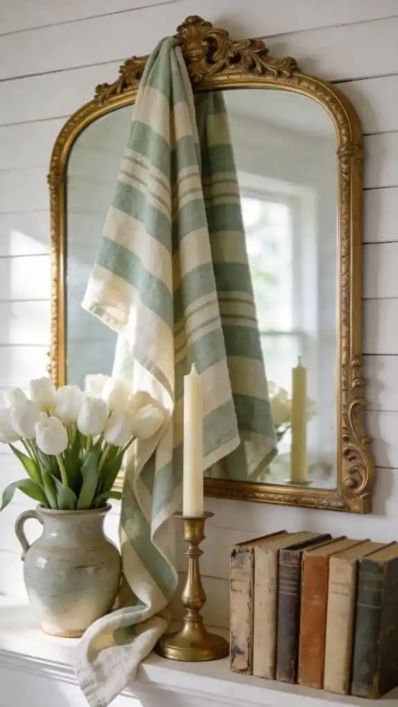 Use tea towels in unexpected ways—drape them over frames, tuck them behind decor, or layer them along the mantel.