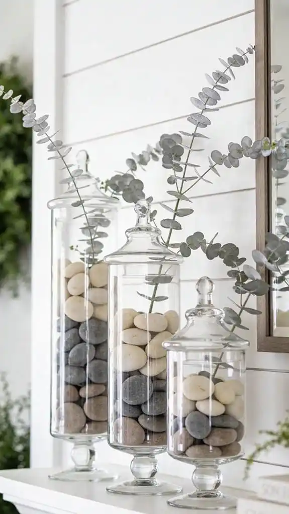 Fill glass jars with stones, moss, or greenery to create a clean, layered effect.