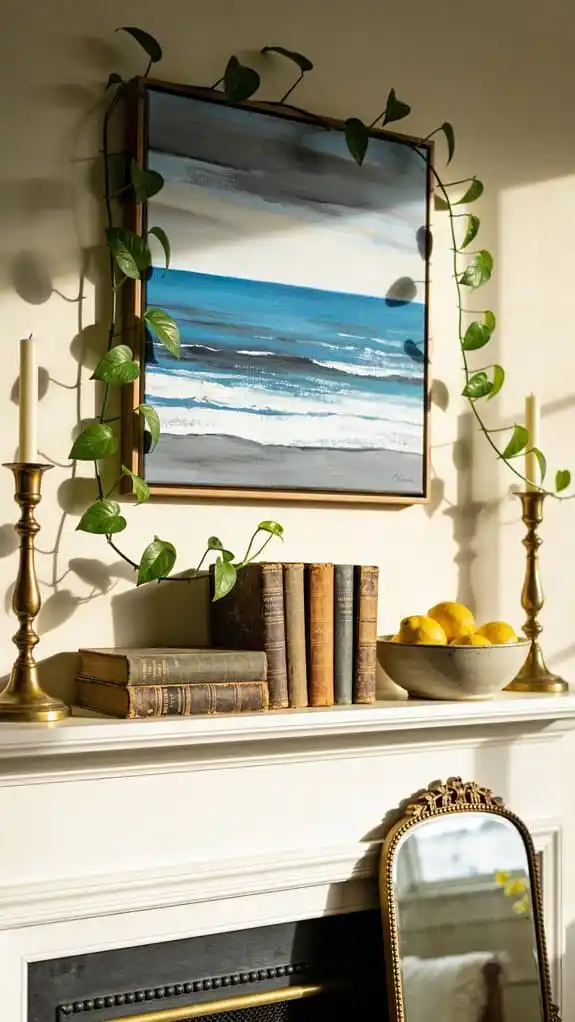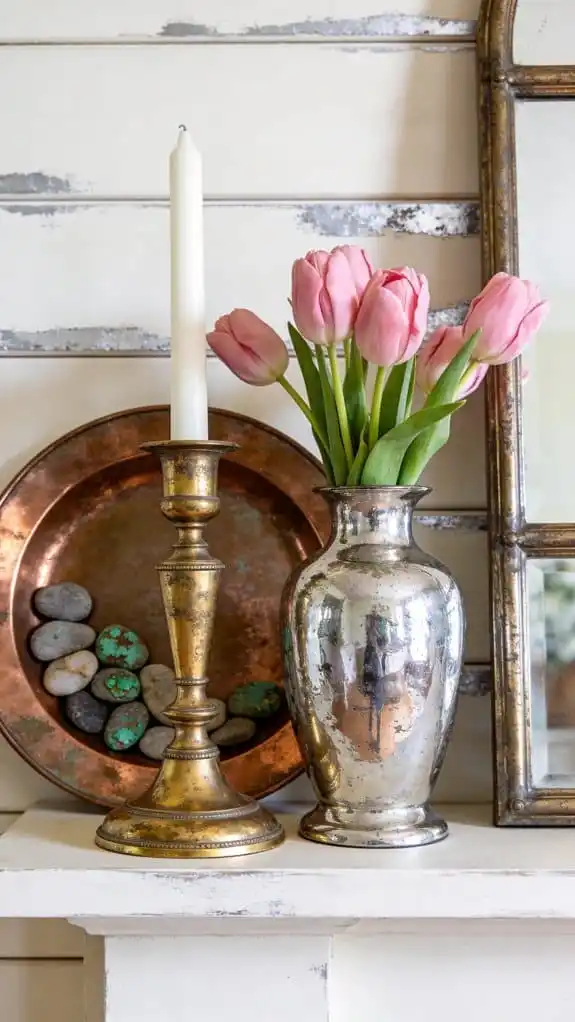 Combine brass, silver, and copper accents throughout your mantel.
