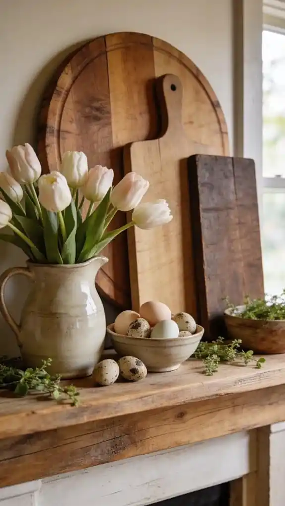 Lean wooden cutting boards behind your decor to add natural texture.